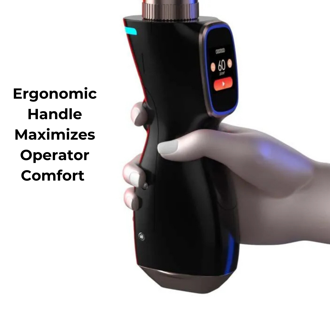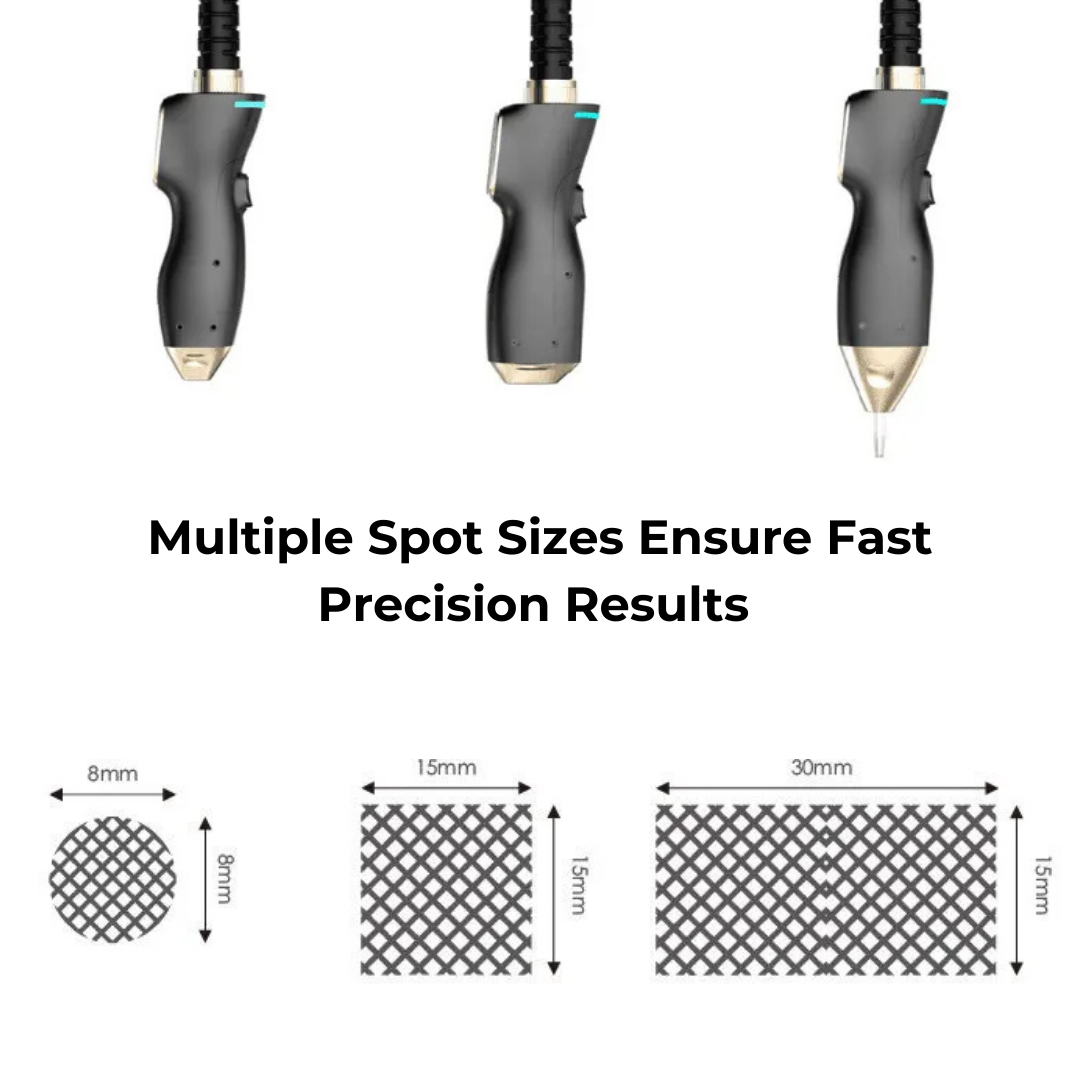 The machine includes an ergonomic handle and three spot size attachments (15x15mm, 15x30mm, and 8x8mm), allowing for precise treatments on smaller areas and efficient treatments on larger areas. This design reduces fatigue for operators by up to 60%.